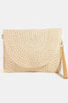 This stunning woven straw crossbody bag features an intricate geometric pattern created through traditional weaving techniques. Made from natural straw or raffia material, it offers an eco-conscious choice for fashion-forward individuals. The envelope-style flap design with magnetic closure ensures your belongings stay secure while maintaining easy access. The bag comes with a detachable leather wrist strap, allowing versatility between clutch and crossbody wear. Its neutral beige tone and textured surface make it a perfect accessory for summer outings, beach days, or adding a bohemian touch to any casual ensemble. The compact size is ideal for carrying essentials like phone, wallet, and keys.